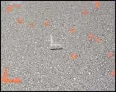 | Medium | ![]() | Medium severity occurs if any one of these conditions exist: (1) In a square yard (square meter) representative area, the number of coarse aggregate particles missing is between 21 and 40. (2) Missing aggregate clusters is between 2 and 10 percent of the examined square yard (square meter) area. In medium severity raveling, there is some FOD potential. |